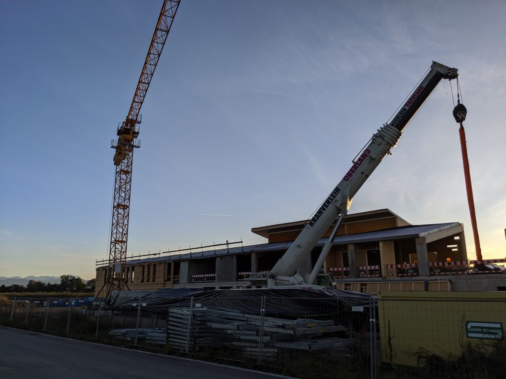 In der Heimatortschaft von Thomas Müller, Pähl am Ammersee entsteht derzeit ein Neubau der Bäckerei Kasprowicz. Hierfür sind wir nicht nur mit einigen Autokranarbeiten im Einsatz sondern auch mit einen Liebherr 110 EC-B vertreten. Auftraggeber ist hierbei die Firma Wiehag aus Österreich. Aufgrund des schnellen Arbeitstempo konnten wir unseren Baukran schon nach gut drei Wochen auf die zweite Position umbauen.