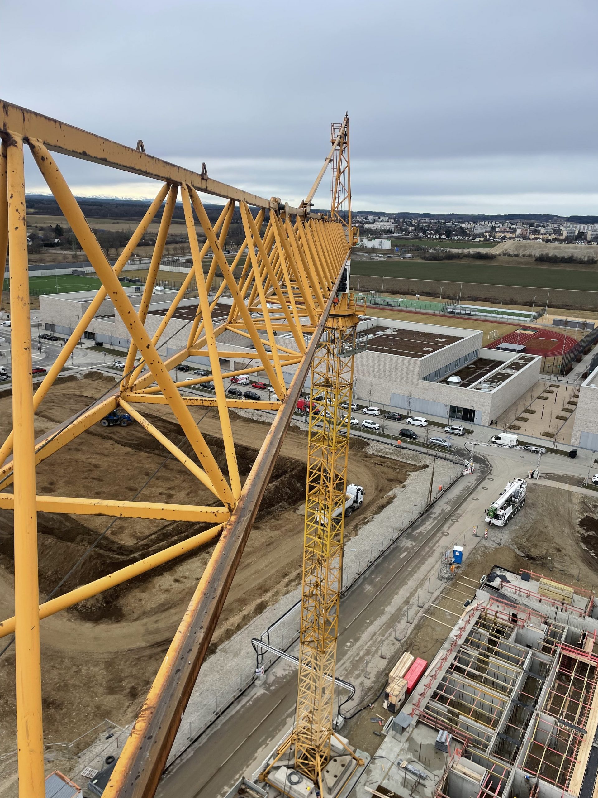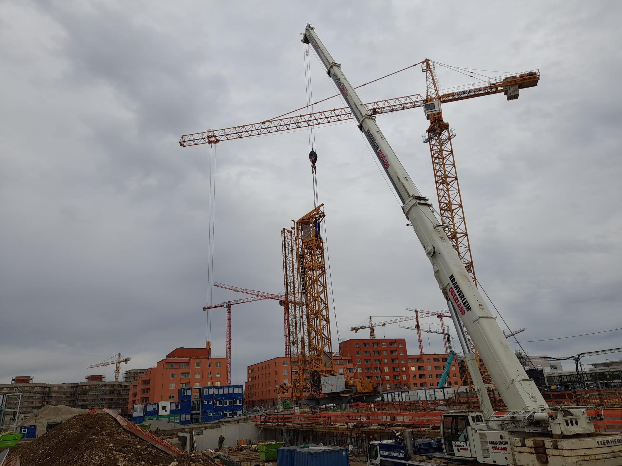 Ursprünglich war für den Neubau in Freiham ein Liebherr 180 EC-H mit einer Hakenhöhe von ca. 32 Metern geplant. Doch auf der Baustelle ist Dynamik an der Tagesordnung: Noch während der laufenden Montage kam der Wunsch auf, die Hakenhöhe kurzfristig auf ca. 41 Meter zu erhöhen.