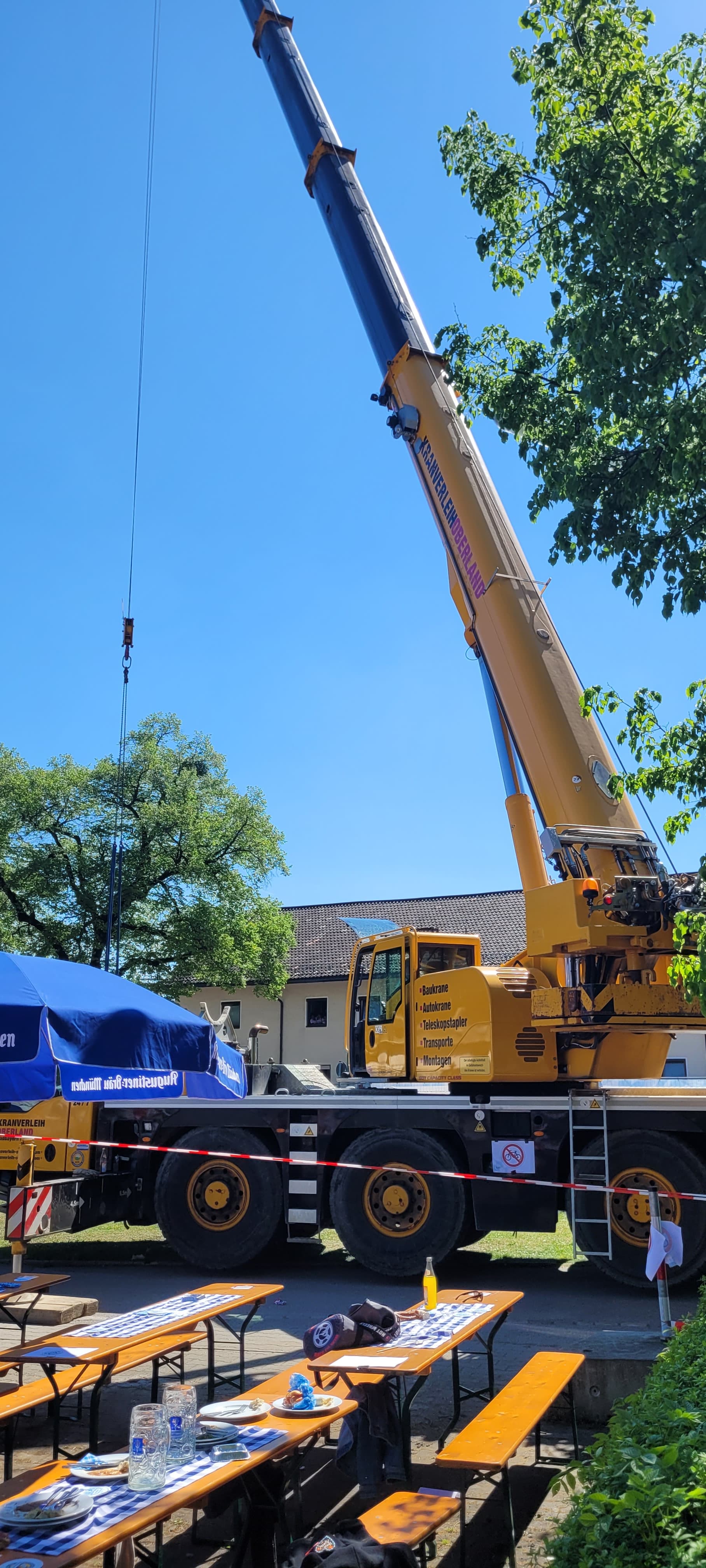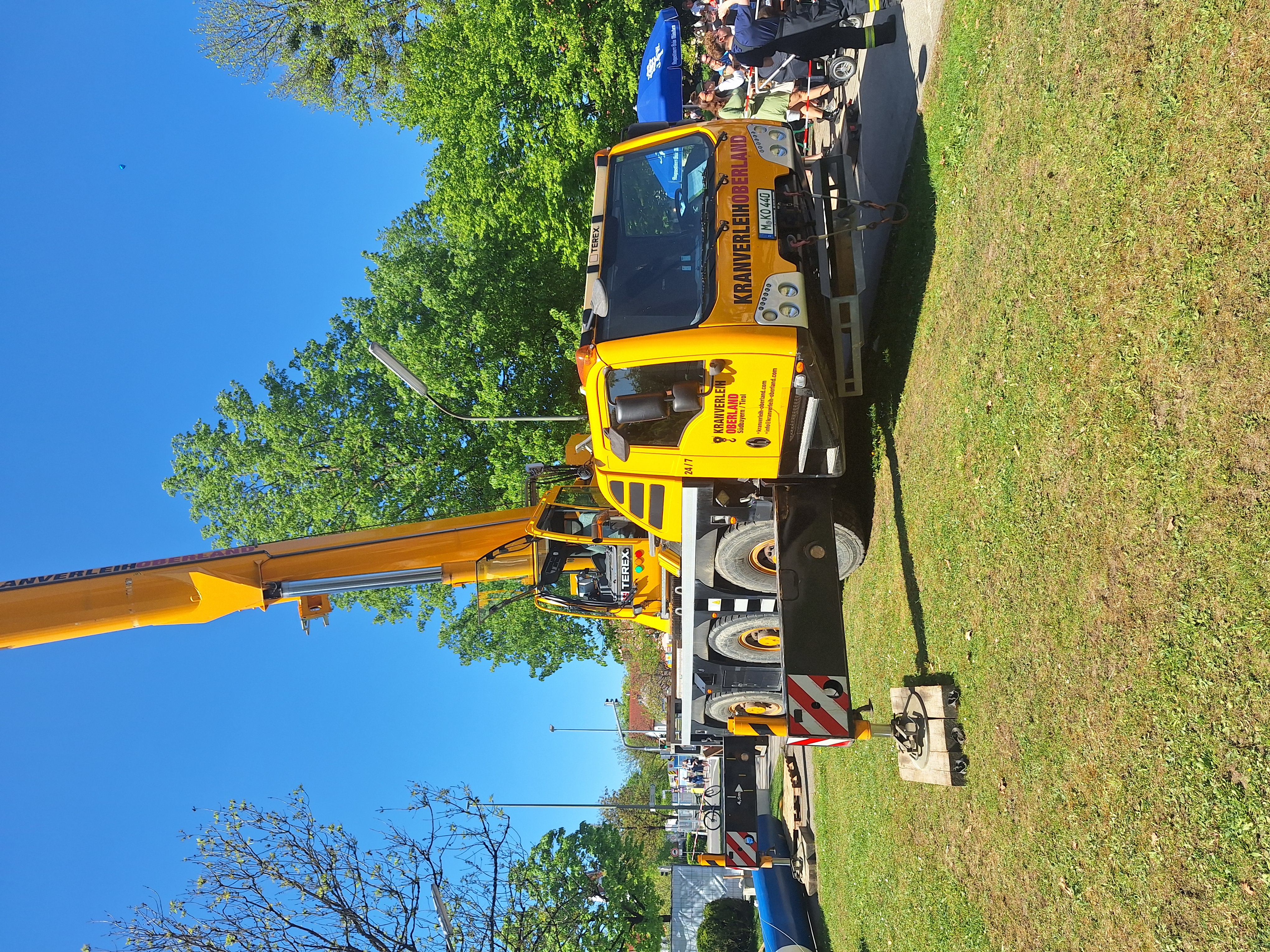 Der stattliche Maibaum wurde zuvor von den örtlichen Vereinen liebevoll vorbereitet und geschmückt. Für das Aufrichten des tonnenschweren Stammes kam unser moderner 60 to. Autokran zum Einsatz. Dank seiner hohen Tragkraft und flexiblen Mobilität konnte der Baum schnell und exakt in die vorgesehene Position gebracht werden – ein wichtiger Beitrag zur Sicherheit bei dieser traditionellen Veranstaltung.