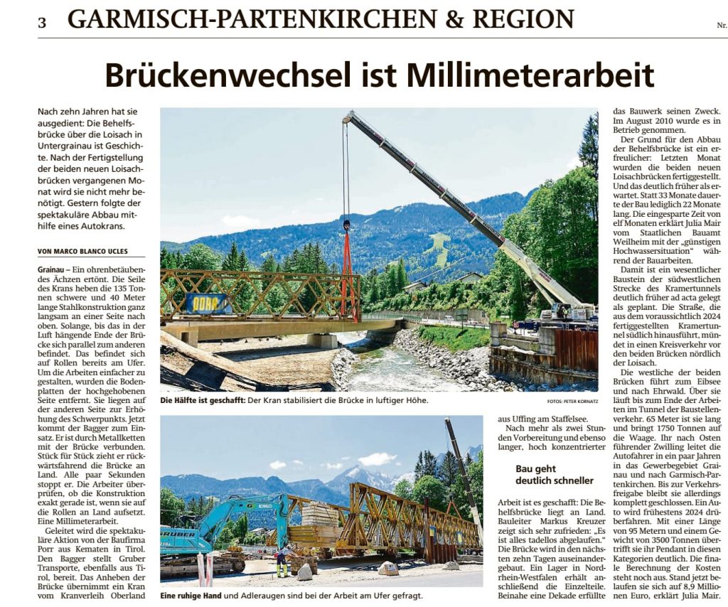 Schon vor einigen Monaten konnten wir einen kleinen Beitrag zu einem Staufreien Garmisch leisten. Im Zuge des künftigen Krammertunnels wurde vor Rund 10 Jahren eine Behelfsbrücke über die Loisach gebaut, nachdem die zwei finalen Brücken fertiggestellt wurden, konnte die temporäre Baustellenbrücke demontiert werden. Hierfür musste die Brücke angehoben werden um Sie mit einem Bagger über das Wasser gezogen zu werden. Insgesamt brachte die Brücke rund 135 Tonnen auf die Waage, dieses Gewicht wurde jedoch vorher durch kleine Demontagen bereits gesenkt. Zum Einsatz für diese Baustelle kam unser Liebherr 220 to. Autokran zum Einsatz. Anschließend wurde die Brücke in Ihre Einzelteile zerlegt und von uns nach Nordrhein-Westfalen gebracht.Wir bedanken uns bei unserem Kunden Porr für das Vertrauen bei diesem Einsatz.