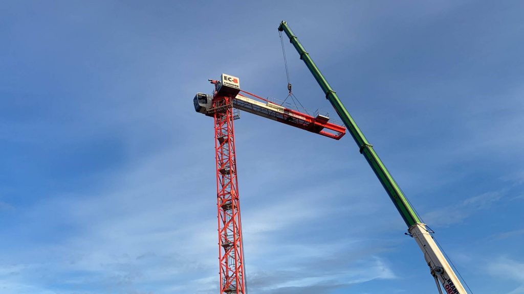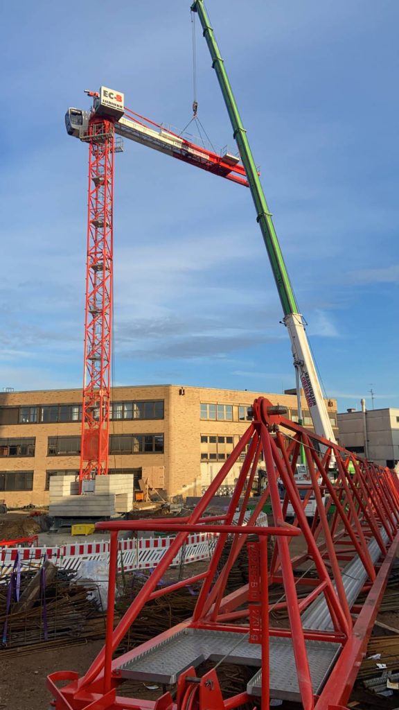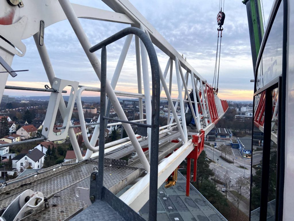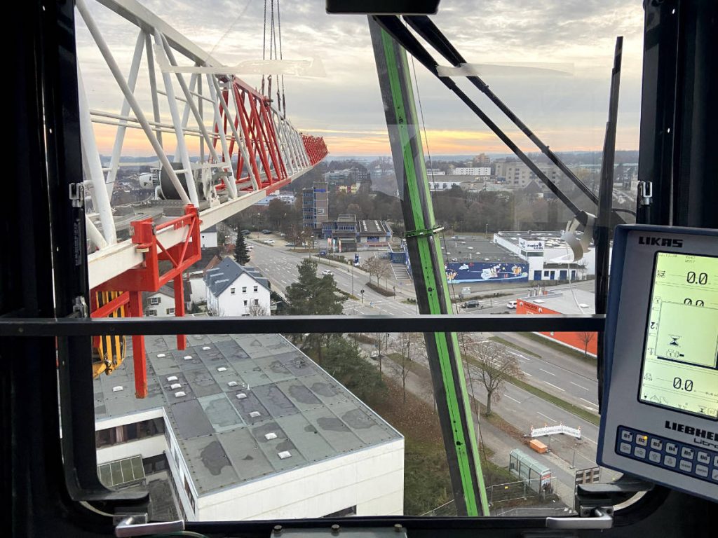 Ende November haben wir in Regensburg für die Firma MICKAN BAU den neuesten Kran aus unserem Mietpark montiert. Bei dem Flat-Top Kran handelt es sich um einen Liebherr 202 EC-B mit einer maximalen Ausladung von 65 Metern und einer maximalen Hubleistung von 10.000kg. Von der Fahrerkabine hat der Kranfahrer nicht nur einen guten Überblick über die Baustelle der Berufsschule, sondern auch über die Innenstadt von Regensburg.